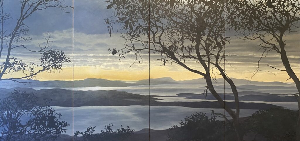 Jonathan’s multi-panelled landscapes unfold as immersive panoramas. Delicate layering of Tasmania’s raw beauty – its flora and fauna – takes us on a journey of meditative contemplation. “I seek to elevate the natural world and our fragile interconnectedness with it,” Jonathan explains. “Communing with nature is deeply spiritual. It’s where I come alive and find my personal bliss. I hope my art encourages others to seek out their pathways.”